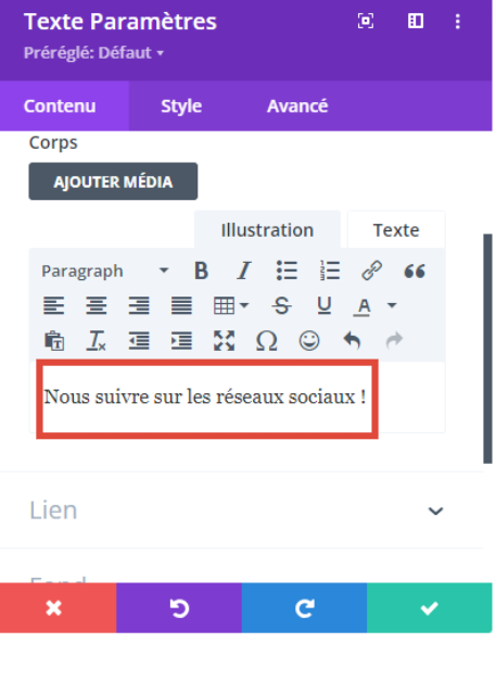1. Pour commencer, ajoutez un module « Texte » dans lequel vous écrivez « Nous suivre sur les réseaux sociaux ! ».