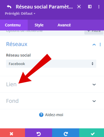 4. Ensuite, dans le paramètre du réseau social, allez dans « lien » puis insérez le lien du réseau.
